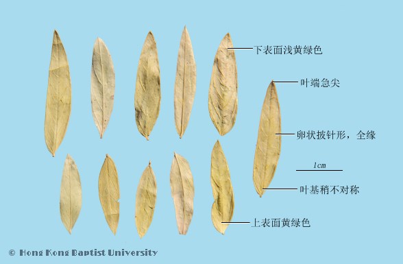 狹葉番瀉葉:呈長卵形或卵狀披針形,長1.5~5cm,寬0.4~2cm,全緣,葉端急尖,葉基稍不對稱。上表面黃綠色,下表面淺黃綠色,無毛或近無毛,葉脈稍隆起。革質。氣微弱而特異,味微苦,稍有黏性。 尖葉番瀉葉:呈披針形或長卵形,略捲曲,葉端短尖或微凸,葉基不對稱,兩面均有細短毛茸。 |