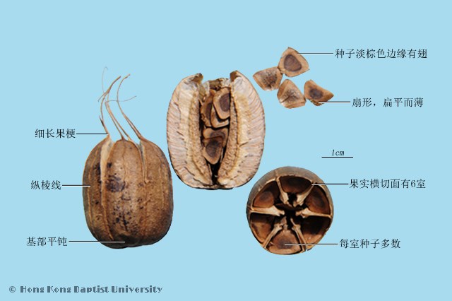 本品呈卵圆形,长3~7cm,直径2~4cm。表面黄绿色、灰绿色或棕褐色,有纵棱线12条,由棱线分出多数横向平行的细脉纹。顶端平钝,基部有细长果梗。果皮轻而脆,易裂为6瓣,果梗也分裂为6条。果皮内表面平滑而带光泽,有较密的横向脉纹。果实分6室,每室种子多数,平叠整齐排列。种子扁平而薄,钝三角形或扇形,长6~10mm,宽8~12mm,边缘有翅,淡棕色。气特异,味微苦。