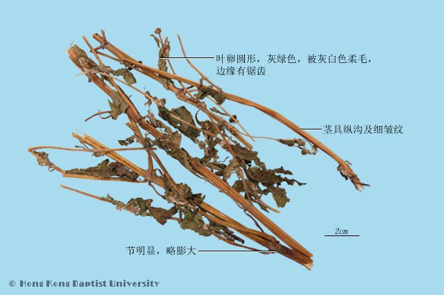 本品茎略呈方柱形,多分枝,长30~110cm,直径0.3~1cm;表面灰绿色、黄棕色或紫棕色,有纵沟及细纵纹,被灰色柔毛;节明显,略膨大;质脆,易折断,断面黄白色或带绿色,髓部宽广,类白色,中空。叶对生,叶片多皱缩、卷曲,展平后呈卵圆形,灰绿色,边缘有钝锯齿,两面皆有白色柔毛,主脉3出。有的可见黄色头状花序,总苞片匙形。气微,味微苦。 |