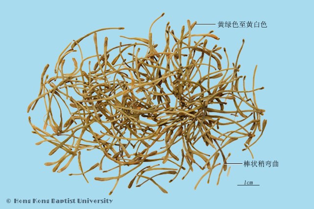 呈棒狀而銷彎,長3~4.5cm,上部直徑2mm,下部直徑1mm,表面綠棕色至黃白色。總花梗集結成簇。開放者花冠裂片,不及全長之半,質稍硬,手捏之稍有彈性,氣清香,味微苦甘。 |