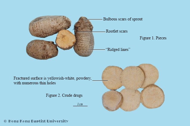 Tuberous rhizome is sub-spherical, oval or oval round shape, 2~7cm long, 2~6cm diameter. Externally yellowish-white or pale yellowish-brown, with irregular horizontal shallow ring grooves and numerous tiny raised rootlet scars, sometimes the base has verrucous sprout scars. Firm texture, yellowish-white fractured surface, powdery, with numerous thin holes. faint odor, slightly bitter taste. |