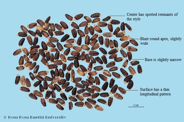 Long inverse oval or elliptical shape, externally pale grayish-brown to black-brown, smooth, with thin longitudinal pattern; apex is blunt round, slightly wide, with one circle, center has spotted remnants of style, base is slightly narrow. Hard texture, 2 cotyledons after being broken. Pale yellowish-white, oily. faint odor, tasteless. |