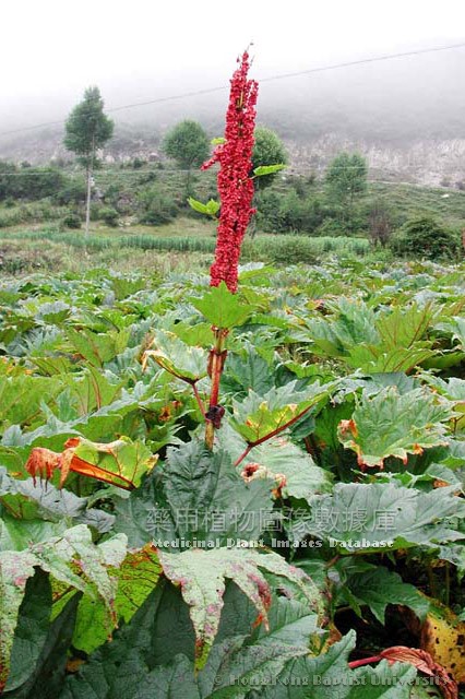 【植物形態】 多年生高大草本,高1.5-2米。根及根莖粗壯木質。莖直立中空,光滑無毛。基生葉大,有肉質粗壯的長柄,約與葉片等長;葉片寬心形或近圓形,徑達40厘米以上,3-7掌狀深裂,裂片全緣或有齒,或淺裂,基部近心形,裂片上面疏生乳頭狀小突,下面被白毛,多分佈於葉脈及葉緣;莖生葉較小,有短柄,互生;托葉鞘大,筒狀,長約15厘米。大形圓錐花序,頂生,分枝彎曲,開展,密被粗糙短毛;花小,呈紫紅色;花梗細,長3-4毫米,關節位於中部以下;花被6,2輪,內輪3片稍大,橢圓形,長約1.5毫米,外輪3片較窄小;雄蕊9;子房上位,三角形,花柱3,向下彎曲,柱頭頭狀,稍凹。瘦果三角形,有翅,長9-10毫米,寬7-8毫米,頂端微凹,基部近心形,暗褐色。種子寬卵形,棕黑色。花期6-7月。果期7-8月。
