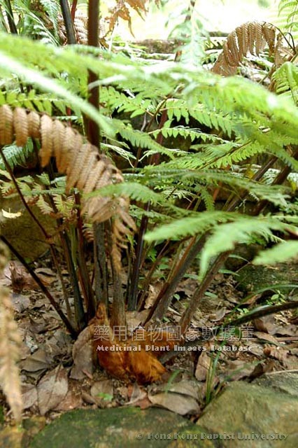 Perennial tree ferns, plants 2.5-3m tall. Rhizomes prostrate, short and stout, 4-8cm in diameter, woody, with dense brown yellow and golden shiny long soft hairs, shiny, shaped like golden nugget. Leaves numerous, clustered into coronary, shape large; petioles stout, brown, 1-1.2m long, base 2-3cm thick, with dense golden yellow long soft hairs and yellow narrowly lanceolate scales, ventral with shallow longitudinal grooves, lower part brown purple; blades coriaceous or thick papyraceous, ovate, 1-1.4m long, 80-110cm wide, tripinnate parted, pinnae 10-15 pairs, alternate, with stalks, narrowly oblong, 50-60cm long, 20-25cm wide; bi-pinnae 18-24 pairs, alternate, with short stalks, linear-lanceolate, 13-15cm long, 2-3cm wide; terminate lobes 23-25 pairs, alternate, narrowly oblong or slightly sickle-shaped, 1-1.8cm long, 3-5mm wide, margin with blunt teeth, with sparse yellow hairs when young, then gradually deciduous; leaf veins pinnate, lateral veins forked. Sori borne at the top of lateral veins of margin, slightly oblong, each lobe with 2-12 pieces, indusium laterally lobed into double lip-shaped, brown. |