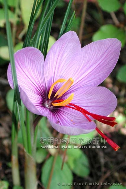 多年生草本。鳞茎扁球形,大小不一,直径0.5-10厘米,外被褐色膜质鳞叶。自鳞茎生出2-14株丛,每丛有叶2-13片,基部为3-5片广阔鳞片乌黑叶线形,长15-35厘米,宽2-4毫米,边缘反卷,具细毛。花顶生﹔花被片6,倒卵圆形,淡紫色,花筒细管状;雄蕊3,花药基部箭形;子房下位,3室,花柱细长,黄色,柱头3,膨大呈漏斗状,伸出花被筒外而下垂,深红色。蒴果长圆形,具三钝棱。种子多数,球形。花期10-11月。 |