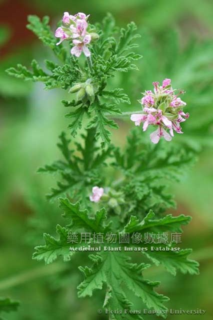 多年生草本,高60-90厘米,莖基部木質,全株具濃厚香味,密被短毛或淡黃色小腺毛。莖基部木質化,節處膨大。葉互生,寬心形或近圓形,近掌狀5-7深裂,裂片再分裂為狹裂片,邊緣被細毛,邊緣具不規則的齒裂,兩面密被毛;葉柄長4-6厘米;托葉扁闊,常脫落。傘形花序與葉對生,柄短,直立;花小;苞片4,卵形或闊卵形: 萼片5;花瓣5,玫瑰紅色或粉紅色,有紫脈紋,上方兩瓣較大;雄蕊10,不具腺體;雌蕊1,子房5室,花柱5。蒴果5裂,成熟時由喙部向上捲曲裂開。花、果期3-6月 |