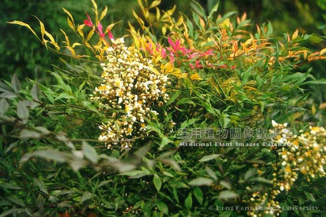 常綠灌木,高約2米,莖直立,圓柱形,叢生,分枝少,幼枝常紅色。葉互生,革質有光澤;葉柄基部膨大呈鞘狀;葉通常為三回羽狀複葉,長30-50厘米,小葉3-5片,各級小葉片全對生,小葉片革質,近無柄,橢圓狀披針形,長3-7厘米,寬1-1.5厘米,先端漸尖,基部楔形,全緣,兩面深綠色,冬季常變紅色,兩面光滑無毛。大型圓錐花序,長13-35厘米,花直徑約6毫米,萼片多數,每輪3片,內兩輪呈白色花瓣狀,內輪較大;雄蕊6,離生,花藥縱裂;子房1室,有2個胚珠,花柱短。漿果球形,熟時紅色或有時黃色,直徑6-7毫米,內含種子2顆,種子半球形。花期5-7月,果期8-10月。 |