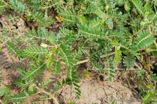 Annual herb. Stem recumbent, covered with long soft hairs or long hard hairs, branch 20-60cm long, petiole lanceolate, small and sharp in shape, about 3mm long, Biserial pinnately compound leaf, opposite, one longer and one shorter; longer leaf 3-5cm long; 1.5-2cm wide, generally with 6-8 pairs of leaflets; shorter leaf 1-52cm long, generally with 3-5 pairs of leaflets; leaflets opposite, long circular, 4-15mm long, tip sharp or blunt, surface hairless or only with filiform hairs along the middle vein, covered with white decumbent filiform hairs. Flower light yellow, small sized, regular, solitary in the leaf axil of the shorter leaf; peduncle 4-10mm long, sometimes 20mm long; calyx 5, ovate lanceolate, gradually pointed, about 4mm long, with hairs on the back, persistent; petals 5, invert ovate, tip slightly truncated, alternate with calyx; stamens 10, grown on the basal part of flower disc, basal part with squamous glands. Ovary with 5 carpels. Fruit separated, quinquangular or spherical, consisting of 5 stellately arranged carpels, each carpel with 1 pair of long and short calthrops, with short hard hairs and tubercule on the back. Flowering: May to August, fruiting: June to September. |