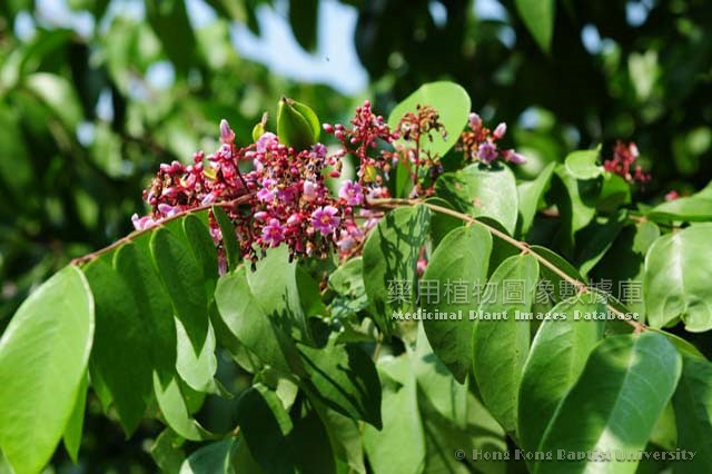 Trees, 5-12m tall. Young branches pubescent with small lenticels. Odd-pinnate compound leaves; common petioles and rachis with hairs, with 5-11 leaflets , ca. 13cm long; leaflets ovate to elliptic, 3-6cm long, ca. 3cm wide, apex acuminate, base skewed. Panicles borne at axil or on old branches, ca. 3cm long; calyx 5, red-purple, imbricately arranged, ca. 3mm long; corolla nearly campanulate, white to pale purple, ca. 5mm long, petals obovoid, arranged in a round shape; stamens 10, in which 5 are relatively short without anthers, filaments base connate; ovary 5-chambered, with 5 edges and grooves, each chamber ovules are numerous. Berry ovate or elliptic, 5-8cm long, pale yellow-green, smooth with 3-5 winged edges. Flowering: July to August, fruiting: August to September. |
