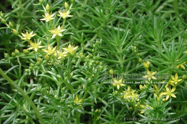 多年生肉質草本,無毛。莖高10-20厘米。根多分枝,鬚根狀。莖纖細傾臥,著地部分節節生根。3葉輪生,少有4葉輪或對生的,質肥厚,葉線性,長20-25毫米,寬約2毫米,先端鈍尖,基部無柄,有短柄。聚傘花序狀,頂生,疏生花,寬4-8厘米,中央有一朵短梗的花,另有2-3分枝,分枝常再2分枝,著生花無梗;萼片5,線狀披針形,長1.5-7毫米,不等長,不具距,有時有短距,先端鈍;花瓣5,黃色,披針形,長4-6毫米,先端急尖,基部稍狹;雄蕊10,較花瓣短;鱗片5,寬楔形至近四方形,長0.5毫米,寬0.5-0.6毫米。蓇葖略叉開,長4-5毫米,花柱短;種子細小,卵圓形,具小乳狀突起。花期4-5月,果期6-7月。 |
