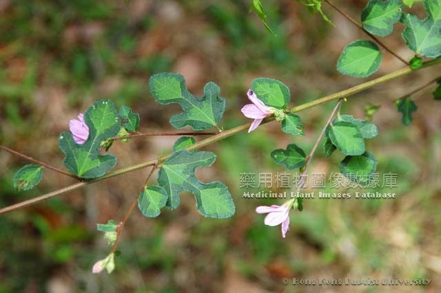 Undershrub, about 80cm high. branch tiled, branchlet covered with stellate tomentums. Leaf alternate; petiole 4-15mm long, covered with tomentums; stipule drill shaped, about 1.5mm long, caducous; leaf blade of lower part palmate 3-5 deeply lobed, lobe opening deep below the middle part, round and narrow, 1.5-6cm long, 1-4cm wide, lobe rhombus or invert ovate, gourd-shaped, blunt in the tip, basal part round or nearly cordate, with sawtooth, both sides covered with stellate short hard hairs, leaf of upper part generally with 3 deep lobes. Flower solitary or nearly fasciate, peduncle 2-3mm long; bractlet about 7mm long, basal part accretes, sparsely covered with stellate hairs; calyx shorter than or equal to bractlet in length, ovate, with sharp tip, covered with stellate hairs; corolla light red, petal 10-15mm long; staminal column hairless, equal to petal in length, fruit spherical, about 6mm in diameter, with spines and long hard hairs, spine end with overhead hook. Seed smooth and hairless. Flowering: June to September. |