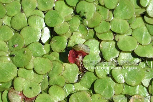 Perennial small herb, floating on water surface. The root 5-11 fascicled, minute, fibrous, 3-5cm long. New buds produced at the side of insertion on root, the new buds connected by a extenuated stalk before separation from the maternal body. Thallus flattened, solitary or 2-5 clustered, broadly obovate, length 4-10mm, width 4-6mm, apex obtuse, slightly concave above, dark green, below purple, with inconspicuous 5-11 palmate veins. Inflorescences grown in the incision of thallus edge; flowers herbaceous, monoecious; spathe bag-shaped, short and small, bilabiate, 2 male flowers and 1 female flower inside, no perianth; 2 stamens in male flower, anther 2 chambers, filaments slender; female flower with pistil 1, ovary sessile, 1 chamber, with erect ovules 2, styles short, stigma flat or circular. The fruit rounded, edge with wings. Flowering: April to June, fruiting: May to July. |