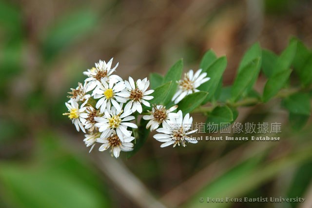 Woody herbs or subshrubs. Young branches covered with dense curly hairs. Upper leaves nearly margin entire; coarse hairs above leaves, hairs or with glands below leaves; middle leaves oblong or oblong-lanceolate, 2-5.5cm long, base gradually narrows or suddenly narrow, petioles short, margin entire or upper part with sparsely small cusp-shaped serration; lower leaves spoon-shaped-oblong, up to 10cm, upper part with sparse serration. Capitulums diameter 1.5-2cm, arranged to conic-corymbose on branch end, or solitary on short branches, peduncles short; bracts dense on peduncle end, extremely fine; involucres inverted-basiconic, 5-7mm long, involucral bracts imbricately arranged, 4-7 layers, outside layer ovate, inside layer oblong-lanceolate, back or upper part with dense hairs, margin with tricholoma, dry membranous; ligulate flower tube 3mm long, tongues white, 5mm long; tubular flower 6mm long, tube 3mm long, with micro-hairs, lobes up to 2mm; pappus 1 layer, white, with micro coarse hairs. Achenes slightly flat, narrow oblong, with dense hairs, sometimes with ribs on both sides. Flowering: July to October; fruiting: August to November. |
